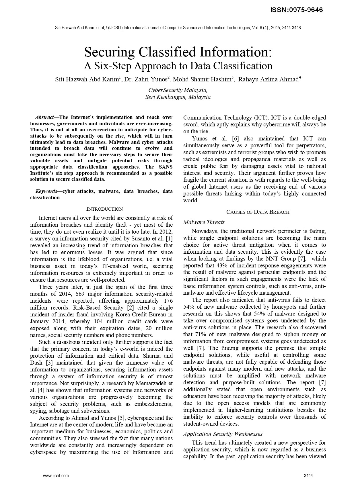 The Internet’s implementation and reach over businesses, governments and individuals are ever-increasing. Thus, it is not at all an overreaction to anticipate for cyberattacks to be subsequently on the rise, which will in turn ultimately lead to data breaches. Malware and cyber-attacks intended to breach data will continue to evolve and organizations must take the necessary steps to secure their valuable assets and mitigate potential risks through appropriate data classification approaches. The SANS Institute’s six-step approach is recommended as a possible solution to secure classified data.
