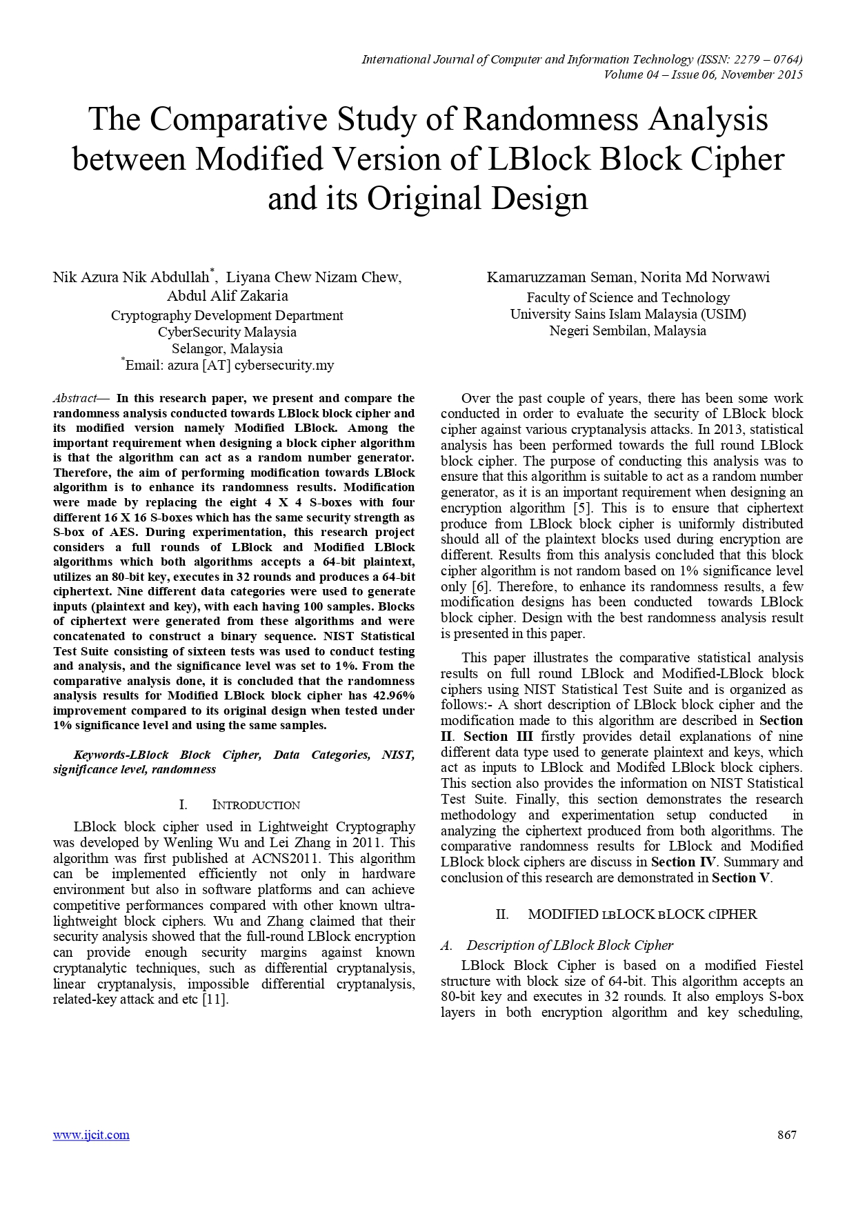 The Comparative Study Of Randomness Analysis Between Modified Version of LBlock Block Cipher And Its Original Design