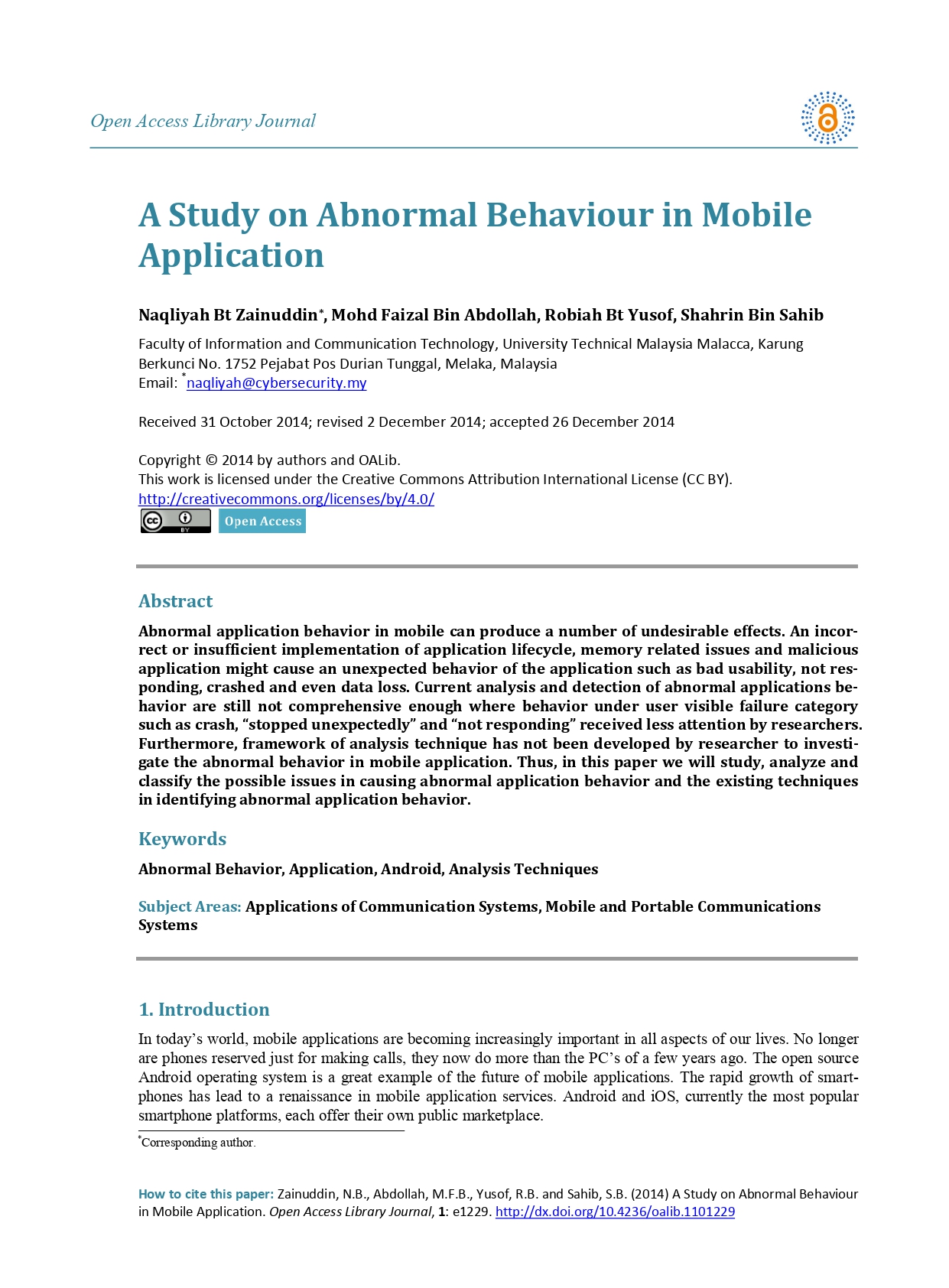 Abnormal application behavior in mobile can produce a number of undesirable effects. An incorrect or insufficient implementation of application lifecycle, memory related issues and malicious application might cause an unexpected behavior of the application such as bad usability, not responding, crashed and even data loss. Current analysis and detection of abnormal applications behavior are still not comprehensive enough where behavior under user visible failure category such as crash, “stopped unexpectedly” and “not responding” received less attention by researchers. Furthermore, framework of analysis technique has not been developed by researcher to investigate the abnormal behavior in mobile application. Thus, in this paper we will study, analyze and classify the possible issues in causing abnormal application behavior and the existing techniques in identifying abnormal application behavior.