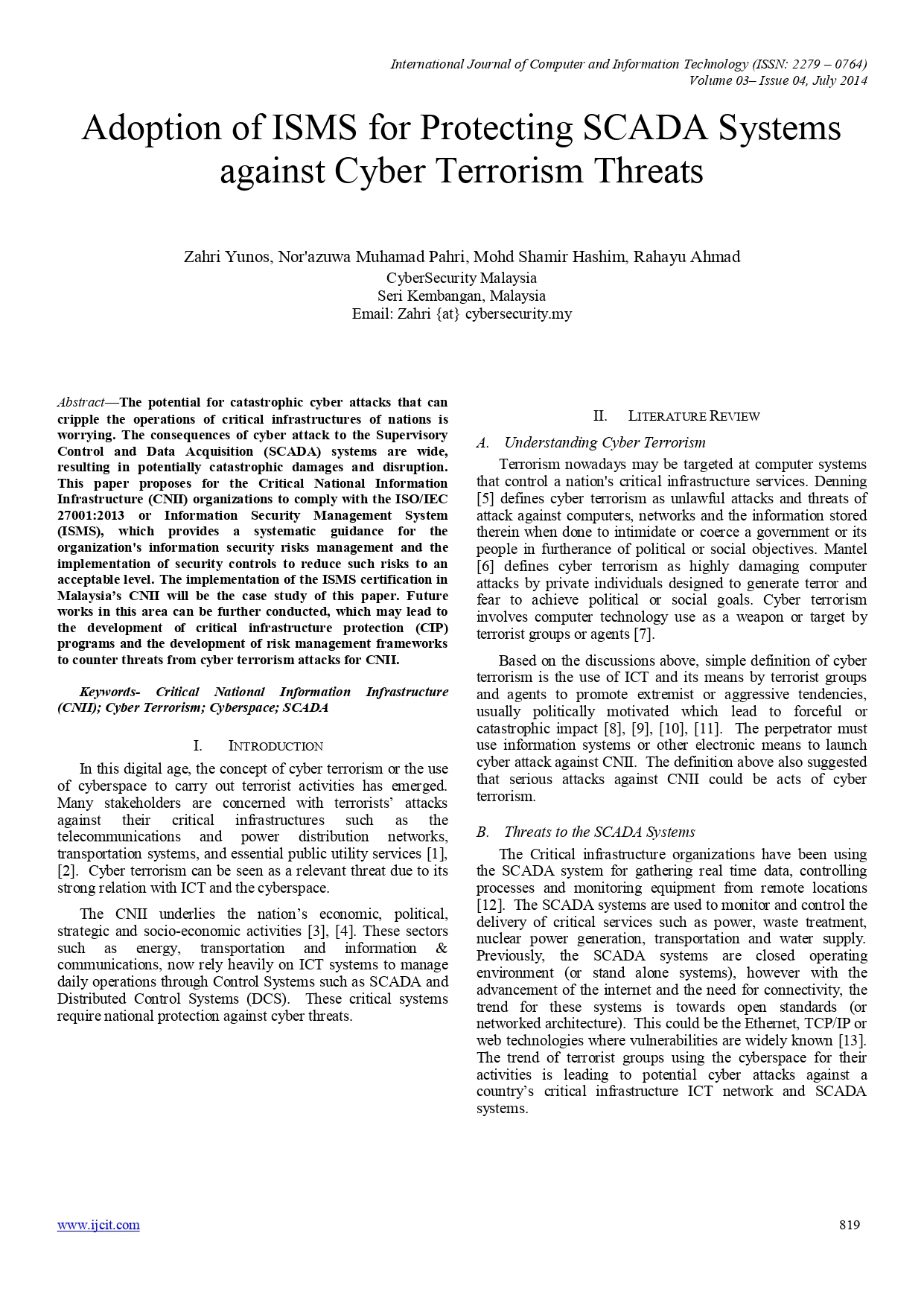 Adoption of ISMS for Protecting SCADA Systems against Cyber Terrorism Threats