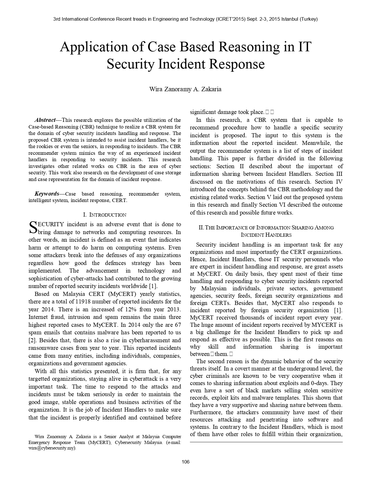 This research explores the possible utilization of the Case-based Reasoning (CBR) technique to realize a CBR system for the domain of cyber security incidents handling and response. The proposed CBR system is intended to assist incident handlers, be it the rookies or even the seniors, in responding to incidents. The CBR recommender system mimics the way of an experienced incident handlers in responding to security incidents. This research investigates other related works on CBR in the area of cyber security. This work also research on the development of case storage and case representation for the domain of incident response.